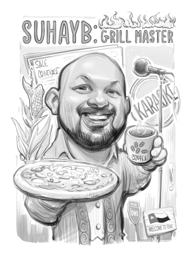Simply send us your photos and other details about the drawing and we will send you a quote. We start with your photos and theme. The first draft you will receive will be to confirm likeness of person. After approved, we add the additional theme, design, wording and logo elements. You will have a chance to proof, comment and request changes on the draft stage. Upon receiving your changes, we redraw the image according to your feedback.