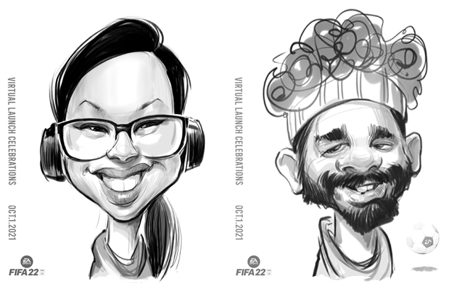 We’ve been providing live virtual caricatures via Zoom, Skype, Gather.Town and Google Classrooms for parties, weddings, corporate meetings and virtual events since 2020 and is still popular for smaller groups, hybrid work or school environments and remote locations. We share our screen so you and your guests are able to see the drawings take form. We will gladly draw a group session, or book individual time slots for private sessions with us.
